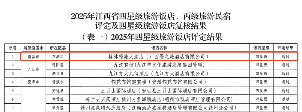 江西省文化和旅游厅近日公布2025年四星级旅游饭店评定结果,格林缦旅集团旗下格林缦旅大酒店成功获评,成为此次评定中南昌市唯一新增的四星级旅游饭店。